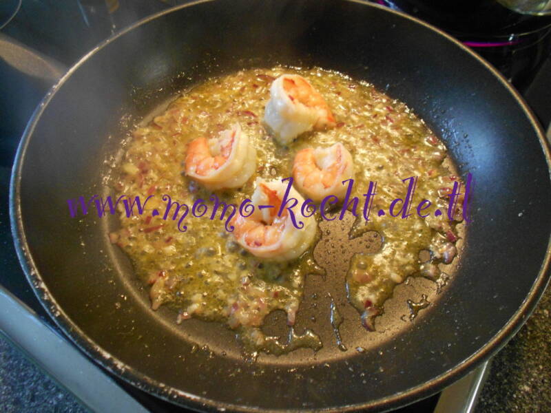 Dies dann ganz kurz anschwitzen und schon die Garnelen dazu geben, diese dann von jeder Seite ca. 1 1/2 Minuten anbraten. Dann mit einem Schuß Weißwein und etwas von dem Nudelwasser ablöschen. Dies dann gut aufkochen lassen. Und mit der Sahne ablöschen.