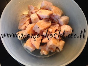 Den Lachs in nicht zu kleine Würfel schneiden und mit Salz & Pfeffer würzen.