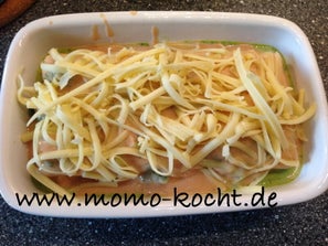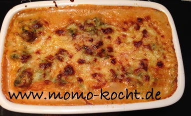 In einer kleinen Auflaufform kommt jetzt zuerst etwas von der Bechamel, darauf dann ein Lasagneblatt, dann etwas von der Lachs-Spinatsoße, darauf dann Bechamel, dann wieder ein Lasagneblatt. Dies machen wir jetzt bis wir 4 Lasagneblätter-Schichten haben. Oben dann wieder Spinatsoße drauf und als letztes die Restliche Bechamelsoße. Jetzt nur noch etwas geriebenen Gouda oder ein paar Scheiben Mozzarella auf die Lasagne geben und in den auf 200 Grad vorgeheizten Backofen für ca. 30 Minuten gold/gelb backen.