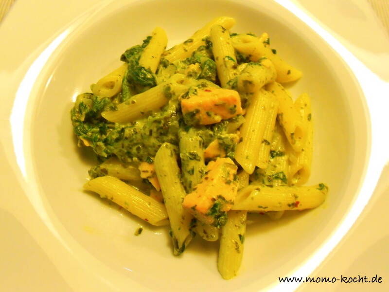 Lachs mit Penne und Bärlauchfrischkäse-Spinat-Soße