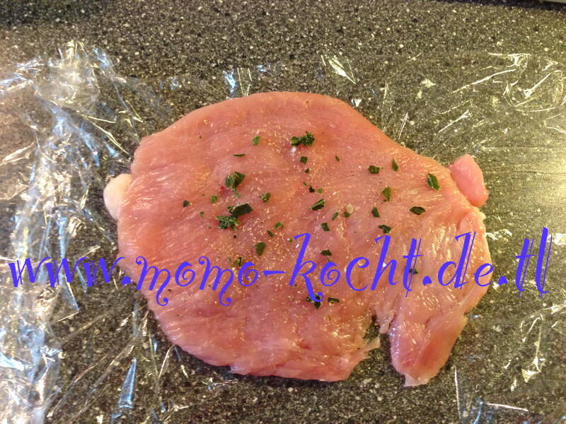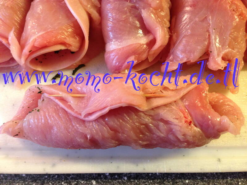 Die Putenschnitzel plattieren und mit etwas Basilikum, Salz und Pfeffer bestreuen. Darauf dann je eine Scheibe Schinken geben und dann die Schnitzel zu einer Rolle zusammen rollen.
