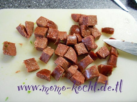 In der Zeit kann man die Sucuk auch in Würfel schneiden, die Größe sollte in etwa die selbe wie bei den Kartoffeln sein.
