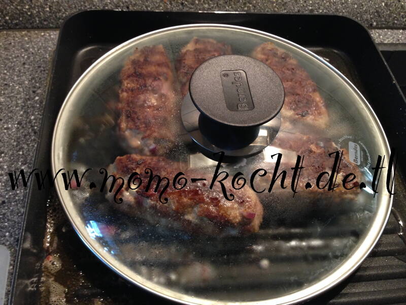 Die fertig geformten Frikadellen kommen dann in eine Grillpfanne mit etwas Rapsöl. Dort werden sie von beiden Seiten knusprig angebraten. Und dann auf kleiner Flamme und mit einem Deckel ca. 10 Minuten zu Ende gegart.