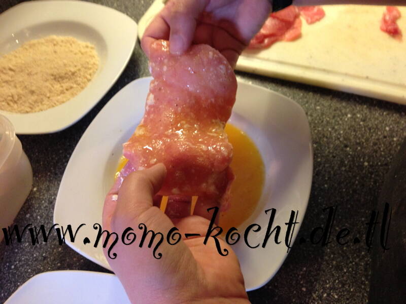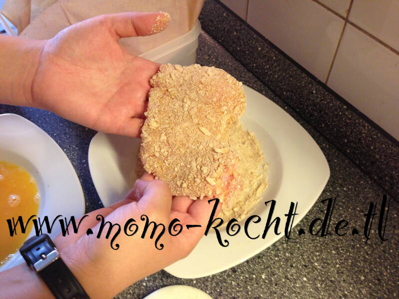 3. beiden Seiten in die Paniermehl/Parmesan-Mischung legen und etwas fest drücken.