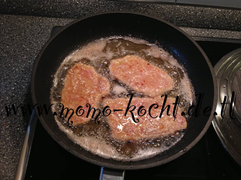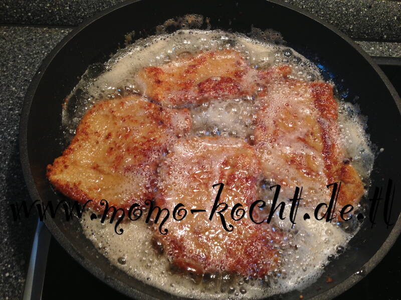 Die Schnitzel dann in viel Rapsöl von beiden Seiten knusprig, braun anbraten. Und zum warmhalten in den Ofen stellen, bis alle fertig gebraten sind.