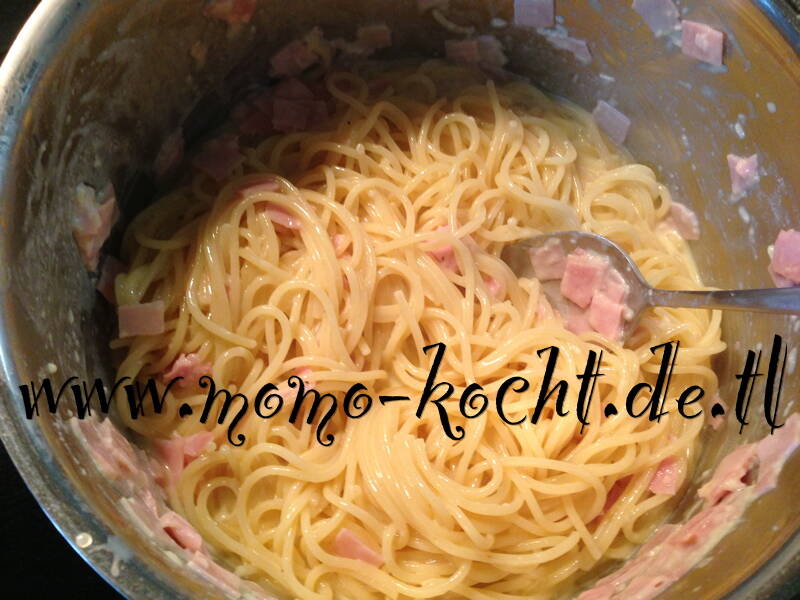Wenn die Spaghetti gar sind werden sie kurz in ein Sieb abgegossen und kommen dann sofort in den noch warmen Topf zurück (so das sie noch feucht sind und noch etwas Wasser an ihnen bleibt). Dazu dann die Ei-Mischung geben und alles gut ca. 2 Minuten lang verrühren, ggf. noch mit Salz und Pfeffer nach würzen.