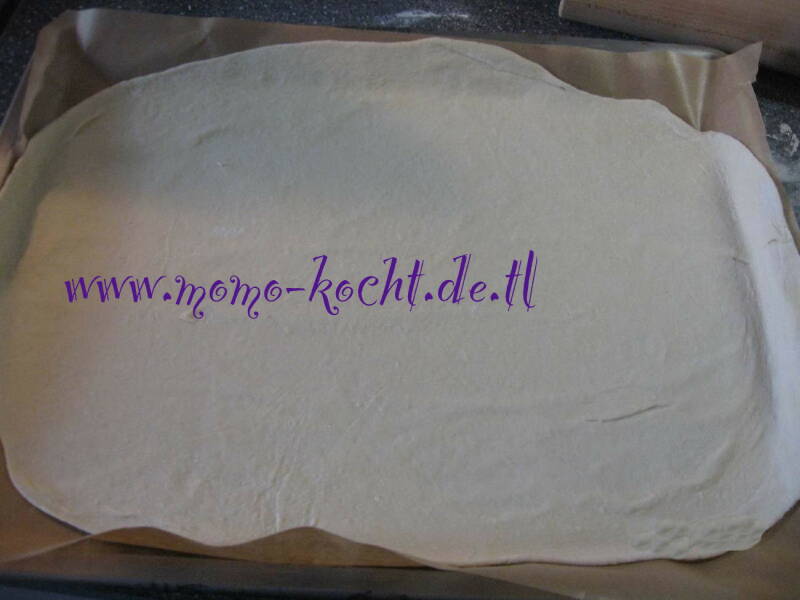Dann wird der Teig in zwei Portionen geteilt und jeweils ganz dünn ausgerollt. Auf jeden Teig-Fladen kommt dann nicht zu dick die Hackmasse und wird gleichmäßig verteilt.