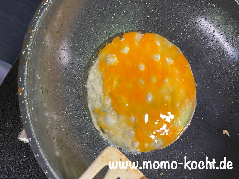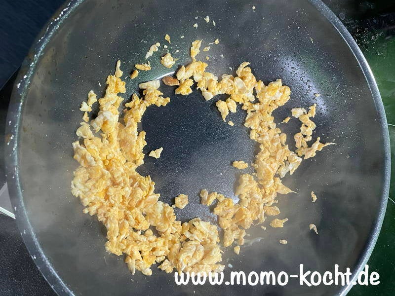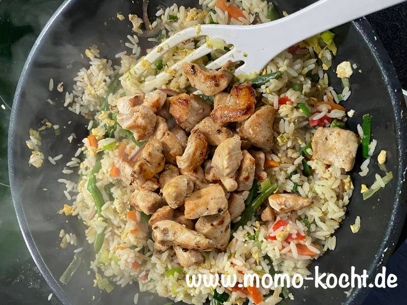 Die Eier in einem Schälchen verrühren und mit Salz und Pfeffer etwas würzen. Dies dann in den heißen Wok geben. Und wie ein normales Rührei braten. Dazu dann das TK Gemüse nehmen (ich habe fertiges Chinagemüse genommen + Bohnen und Blumenkohl). Dies dann 5 Minuten im Wok braten lassen. Dann kommen die Zwiebeln und der Knoblauch hinzu. So wie etwas frischen Lauch. Dies noch ein paar Minuten mitbraten. Dann kommt der Reis dazu. Nun alles gut vermischen und noch 3 El Sojasoße dazu geben, so wie das gebratene Fleisch. Alles nochmal gut verrühren und mit Pul Biber, Salz, Pfeffer und ggf. noch Wok Gewürz abschmecken. Nach ein zwei Minuten in der Pfanne ist der Reis auch schon heiß und das Essen ist fertig.