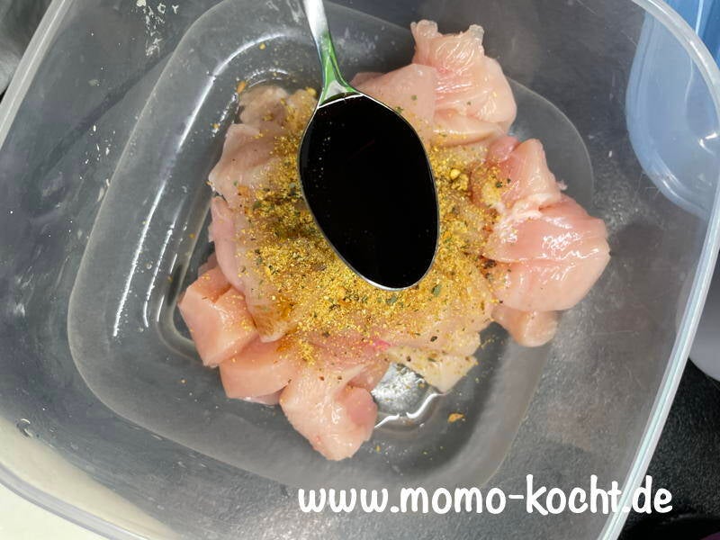 Das Hähnchen in eine Schüssel geben und mit dem Wok Gewürz und einem EL Sojasoße vermischen.