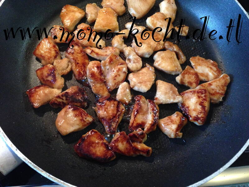 Die Hähnchenbrust wird dann von beiden Seiten angebraten, so das sie aber noch leicht rosa in der Mitte ist. Sonst wird sie zu trocken. Dann muss sie nur noch etwas abkühlen, in der zeit kann man den Salat machen: