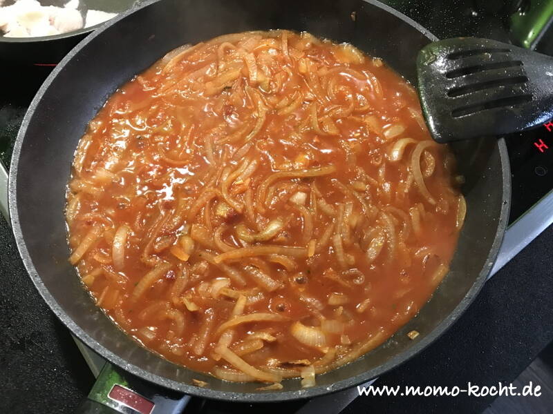 Wenn die Zwiebeln soweit sind wird das Tomatenmark und das Paprikamark mit dazu geben und auch kurz mit gebraten. Jetzt noch mit Weißwein ablöschen und diesen verkochen lassen. Zum Schluss die Brühe dazu geben und alles gut verrühren.