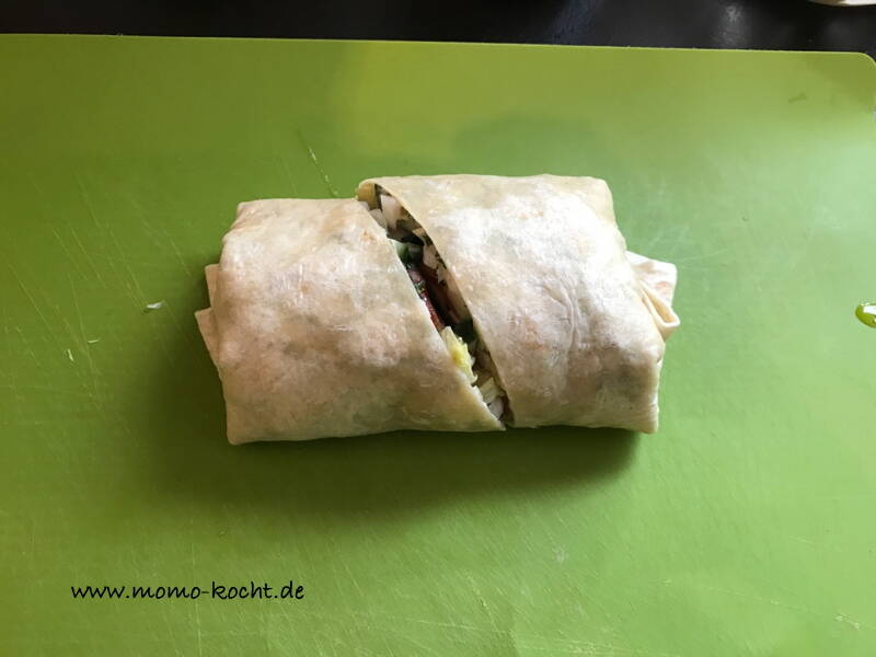 Dann erst die untere, dann die obere Hälfte des Fladens zur Mitte klappen. Den ganzen Fladen dann so drehen das er der Länge nach oben vor einem liegt. Jetzt die untere Hälfte zur Mitte klappen und von dort aus weiter drehen, so das eine Rolle entsteht. Diese dann in der Mitte einmal quer durchschneiden, so erhält man zwei Stücke. Mit dem zweiten Fladen machen wir das selbe wie oben beschrieben. So lassen sich die Tortillas auch sehr gut transportieren, z.B. für einen Ausflug. Oder man genießt sie sofort.