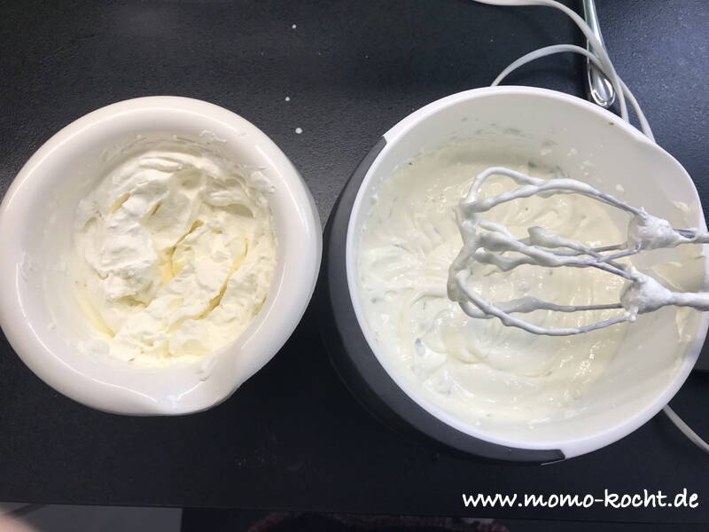Und wir machen nun die Creme. Dazu die Sahne mit den beiden Päckchen Sahnesteif steif schlagen. In einer anderen Schüssel geben wir die Mascarpone, den Joghurt, den Zucker, den Vanillezucker, und ein paar klein gehackte Blätter Zitronenverbene (wer keine hat, lässt sie weg), etwas geriebene Zitronenschale und den Saft einer Zitrone. Dies wird kurz aufgeschlagen, dann kommt die Sahne dazu und wird quirlen noch mal alles zusammen durch.