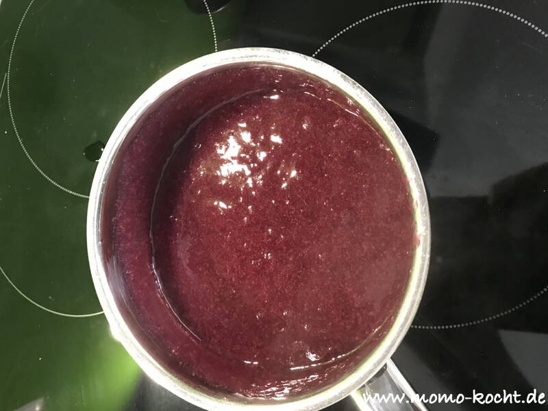 Jetzt noch Traubensaft (ich hatte frischen von meinen Trauben aus dem Garten) und den Zucker in einen Topf geben, dies mit 3 Päckchen klaren Tortenguss vermischen und nach Packungsbeilage zubereiten. Nach einer Minute abkühlen, den Guss auf die Torte geben, dies geht gut mit einem EL.