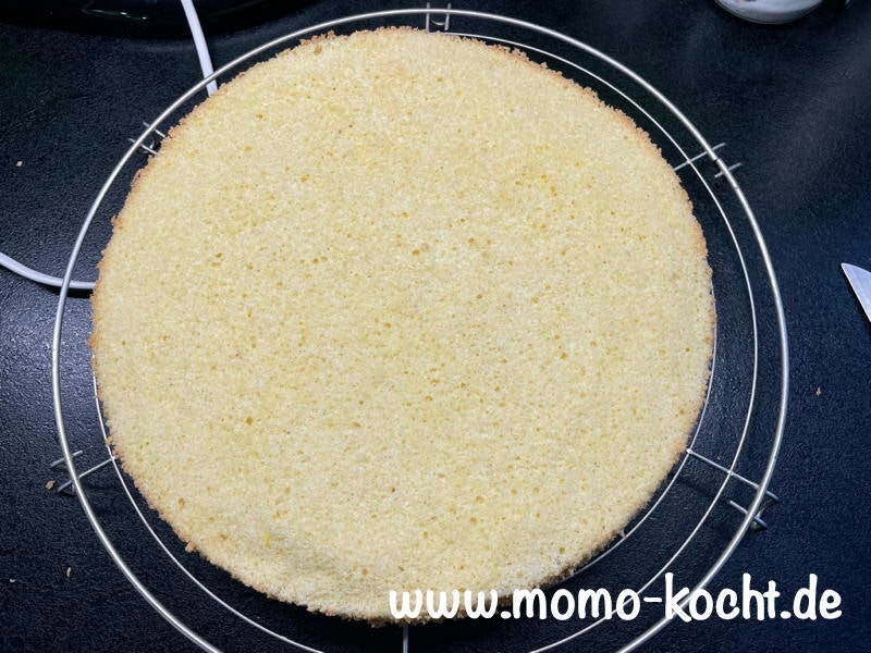 Nach dem Backen warte ich 5 Minuten dann lockere ich an den Rändern den Teig von der Form und wende ihn dann auf ein Auskühlgitter zum auskühlen.