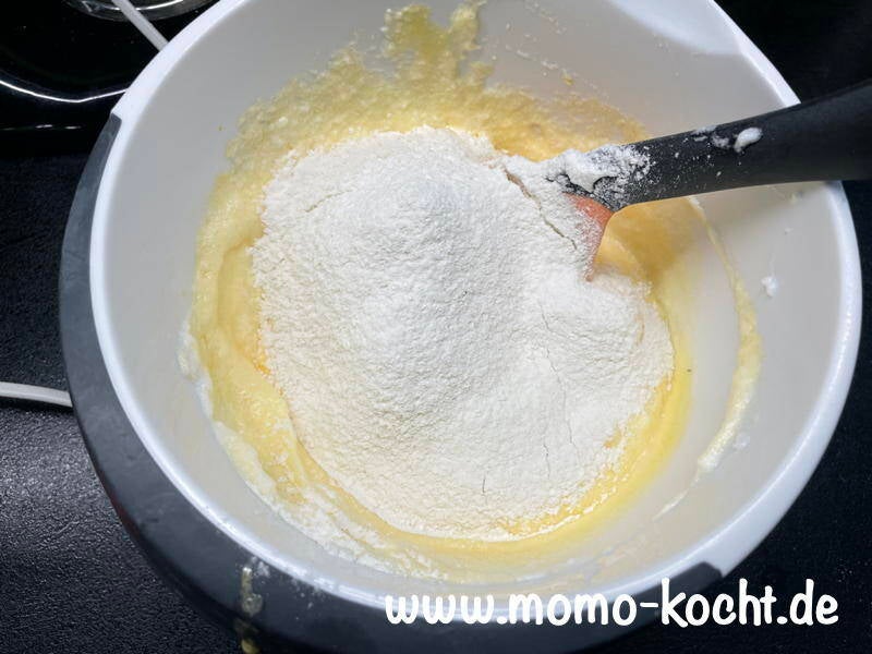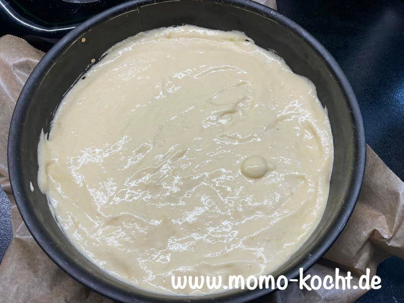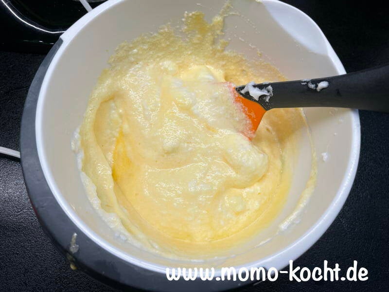In einer anderen Schüssel das Eigeld kurz aufschlagen und den Eischnee locker unterrühren. Das Backpulver mit dem Mehl mischen, sieben und vorsichtig unterheben. Dann den Boden einer Springform mit Backpapier auslegen und den Teig in die Springform geben. Wichtig ist den Rand nicht einzufetten, da der Teig sonst nicht hoch geht! Dies kommt dann bei 180 Grad ober/unter Hitze 10-15 Minuten in den Backofen.