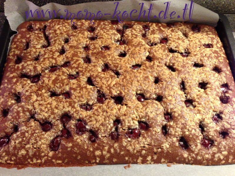 Den Teig dann auf ein Backblech mit Backpapier geben (ich habe eine extra Blechkuchenform genommen, geht aber auch ein normales Blech!) und glatt streichen. Darauf die abgetropften Kirschen gleichmäßig verteilen. Die Schokolade zum Schluss einfach über den Kuchen reiben.