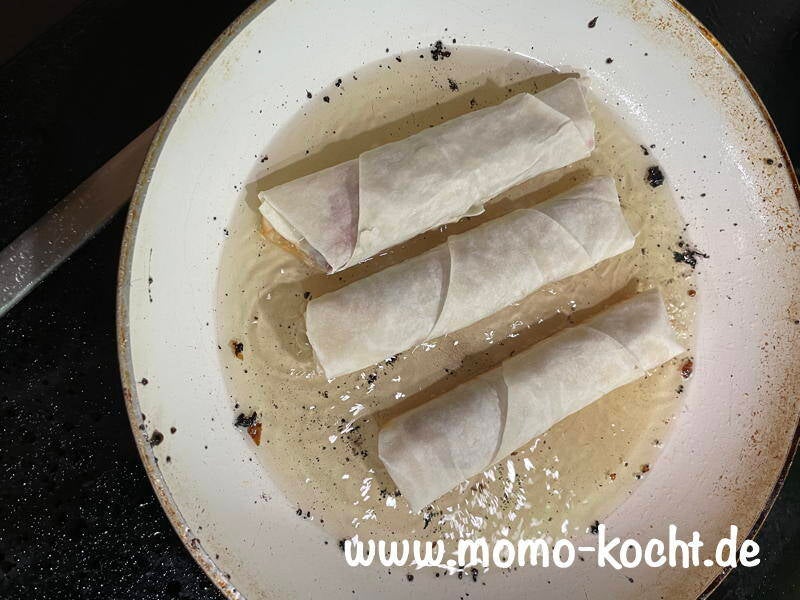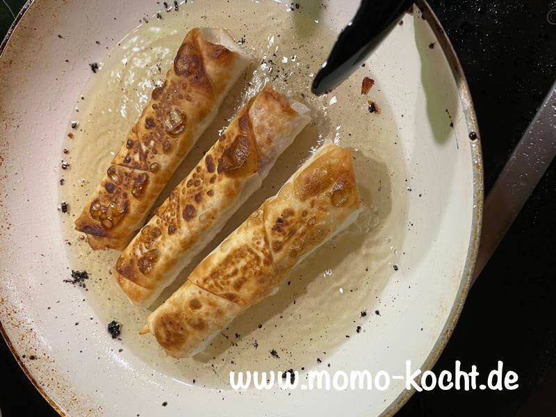 Wenn alle fertig gerollt sind, wird in einer Pfanne reichlich Rapsöl gegeben. Dort drinnen werden nun die Kirschtaschen gold-braun angebraten. Wichtig ist das man immer die Seite mit der Spitze als erstes nach unten zum anbraten nimmt. Da sie so nicht auseinander fallen. Außerdem sollte das Öl sehr heiß sein, damit sie schnell fertig gebraten sind, da sie sonst schnell auslaufen.