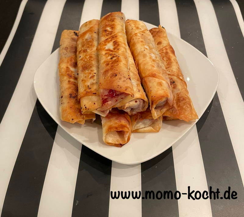 Nun die beiden Seiten oben auf die Mischung klappen. Dann die Blätter einfach aufrollen. Das Ende wird mit etwas Wasser nass gemacht, damit alles hält.