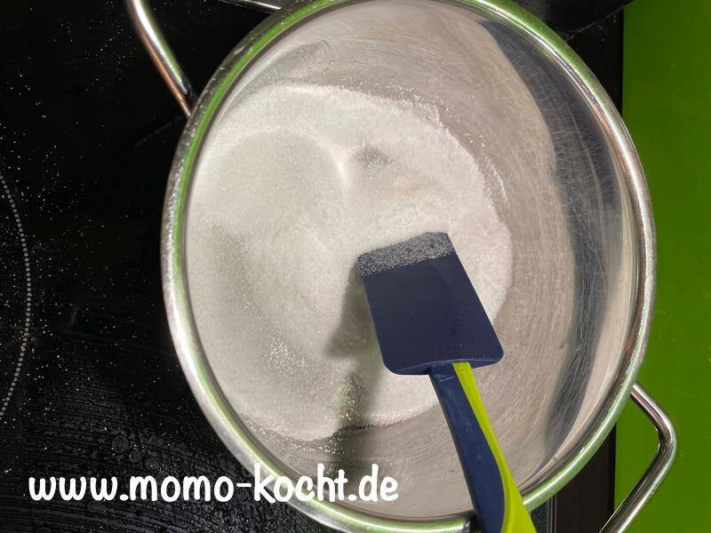 In einem Topf den Zucker langsam schmelzen und goldbraun werden lassen.