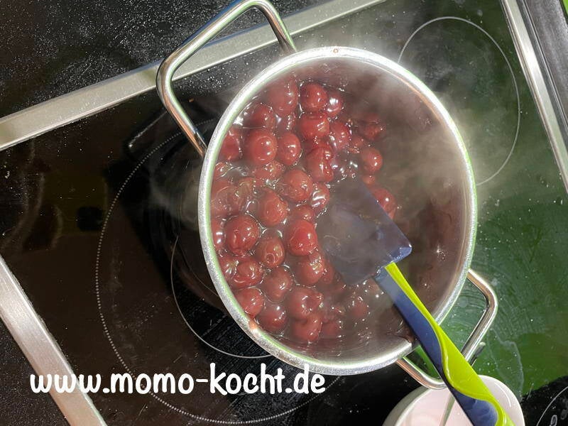 Darauf dann den Saft geben genauso wie den Zitronensaft und dies gut verrühren, dann können auch die Kirschen dazu. Das alles gut verrühren und aufkochen lassen. Jetzt wird die angerührte Speisestärke dazu gegeben und aufgekocht, bis es andickt.