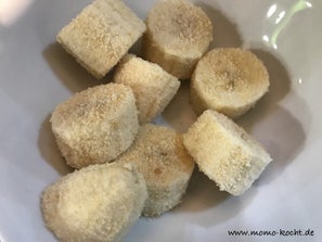 Die Banane in dickere Stücke schneiden. Die Stücke dann jeweils in Paniermehl wenden.