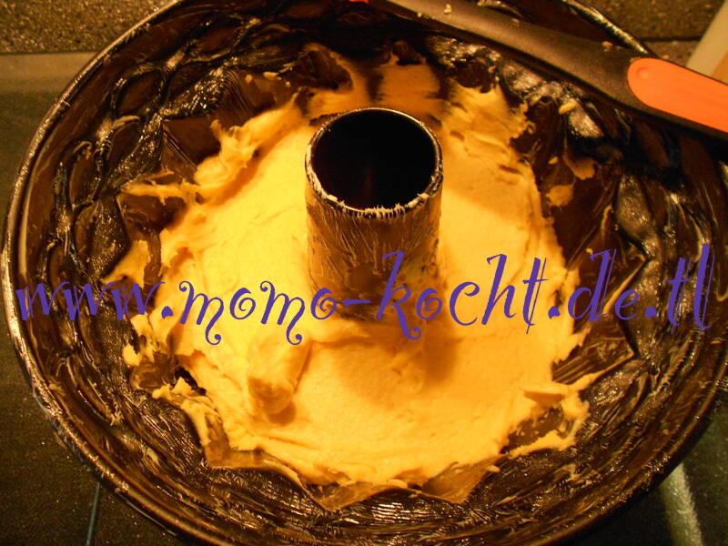 Alle Zutaten kommen in eine Schüssel und werden mit dem Dreimix gut verrührt. So das ein geschmeidiger Teig entsteht. Dieser kommt dann in die gefettete Gugelhupfform.