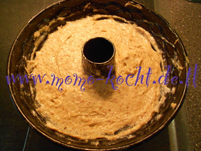 Zuerst die Gugelhupfform mit Butter einfetten und ca. 1-2 EL von den gemahlenen Mandeln nehmen und damit die Form von innen ausstreuen.