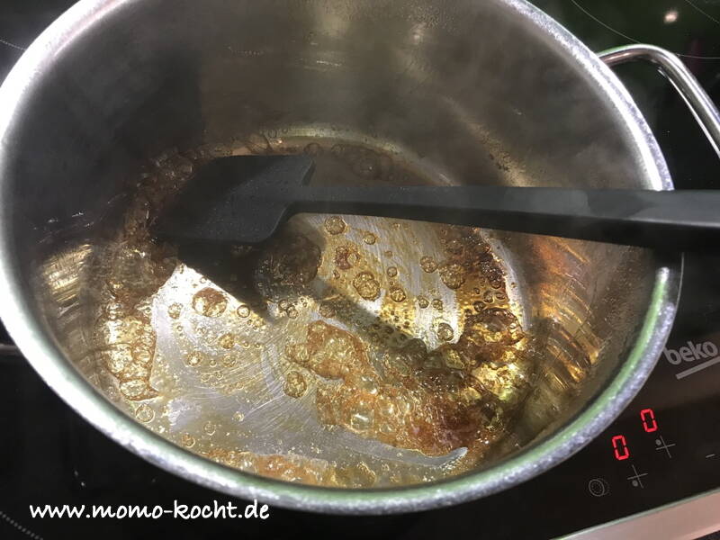 In einem Topf den Bourbon-Vanille-Zucker erhitzen und wenn er anfängt zu schmelzen und braun zu werden wird mit dem Zitronensaft und danach sofort mit dem Traubensaft abgelöscht (dabei viel rühren, sonst brennt der Zucker an). Und den Gelier Zucker dazu geben. Dies auf höchster Stufe zum kochen bringen. Wenn es anfängt zu kochen muss er 5 Minuten, weiter auf Höchster Stufe, unter rühren kochen.