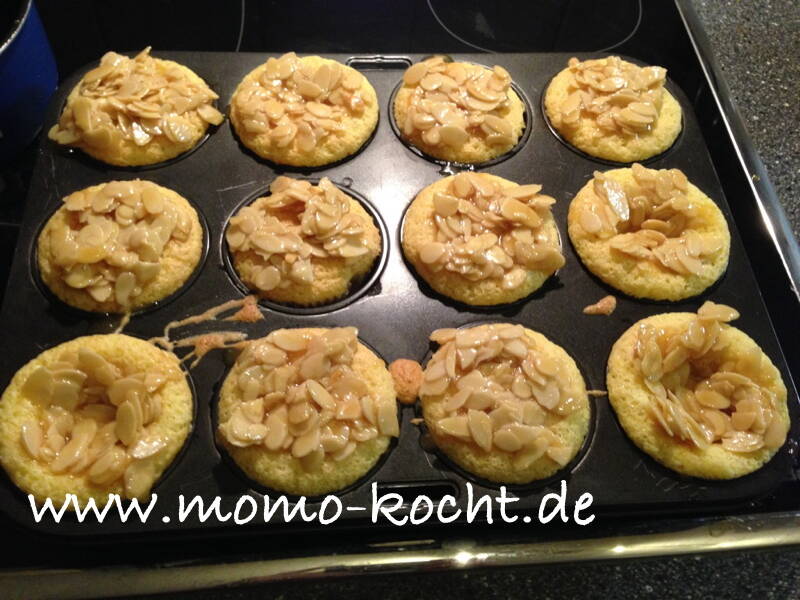 Nach 15 Minuten kommen die Muffins kurz aus dem Ofen und die Mandelmischung wird gleichmeißig auf den Muffins verteilt. Dies geht am besten mit zwei Teelöffeln. (Wenn manche Muffins etwas einsacken ist das nicht so schlimm!). Nun kommen sie wieder in den Backofen, dieses mal für 10-12 Minuten, bis die Mandelkruste schön gold-braun ist.