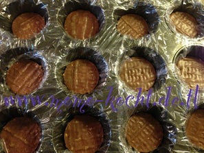 Eine Muffinsform mit Frischhaltefolie auslegen und darin die Cookies verteilen (mit der Schoko-Seite nach oben)