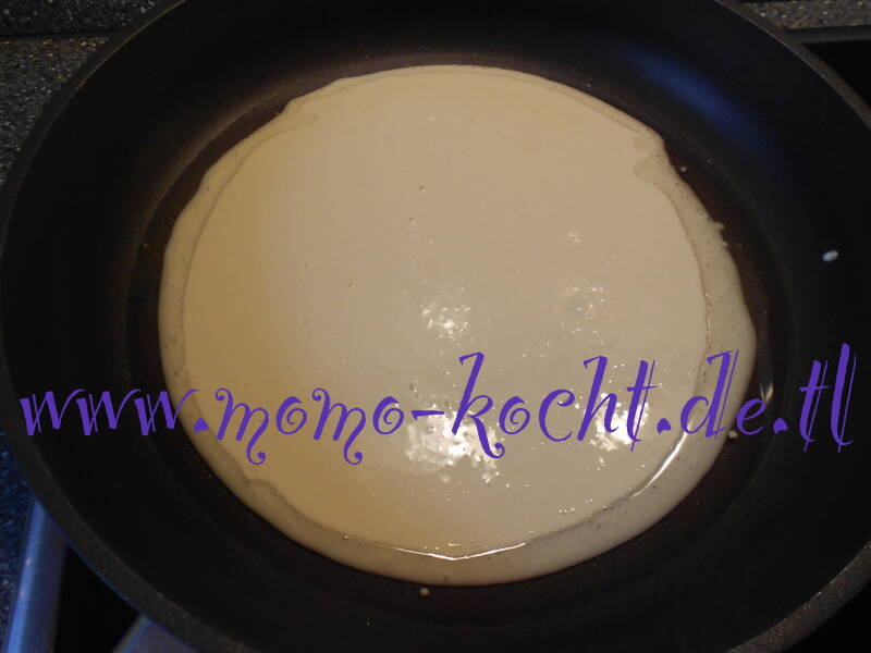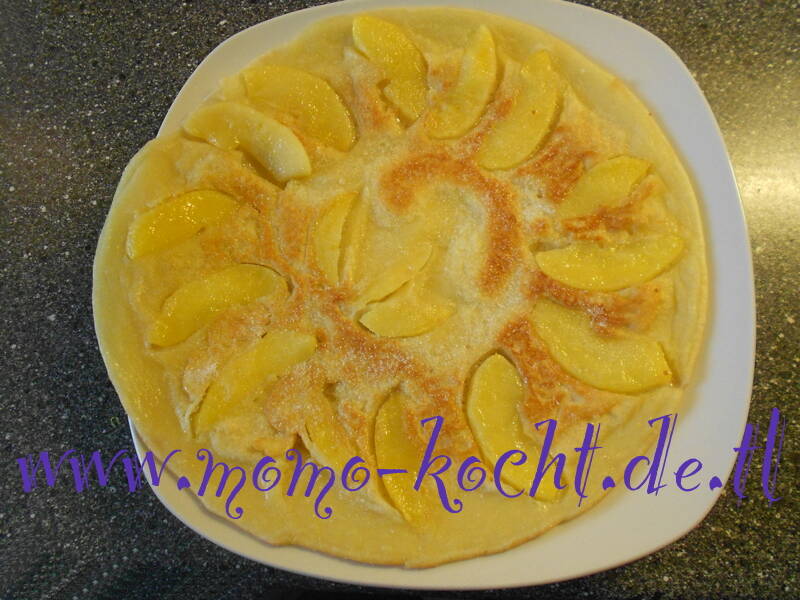 In einer großen Pfanne etwas Öl leicht erhitzen und die Hälfte des Teiges dort verteilen. Außerdem die Hälfte der Äpfel Fächerartig darauf verteilen. Auf die Äpfel dann noch etwas Zucker verteilen. Auf mittlerer Hitze dann von beiden Seiten leicht braun braten.