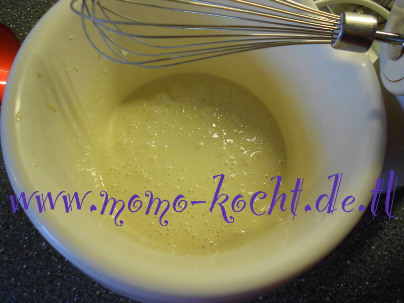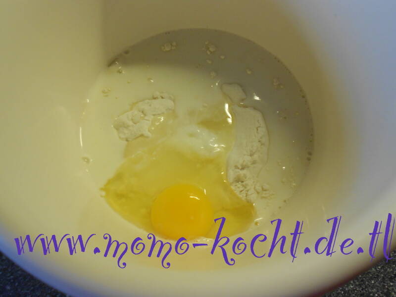 Alle Zutaten, bis auf den Apfel in eine Schüssel geben und mit einem Schneebesen (Dreimix) aufschlagen, so das kleine Blasen entstehen.