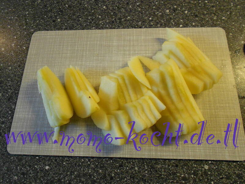 Den Apfel schäle, vierteln, vom Kerngehäuse befreien und in dünne Scheiben schneiden.