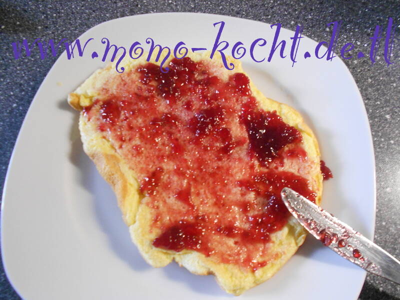 Dann kommt etwas Marmelade (klassisch Erdbeermarmelade, geht aber auch jede andere) auf das Omelette. Nun einfach zuklappen und mit etwas gesiebten Puderzucker bestreuen.