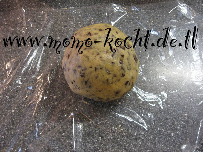 Danach mit den Händen zu einer Kugel formen. Die Kugel kommt dann in Folie und wird für 30 Minuten kalt gestellt.
