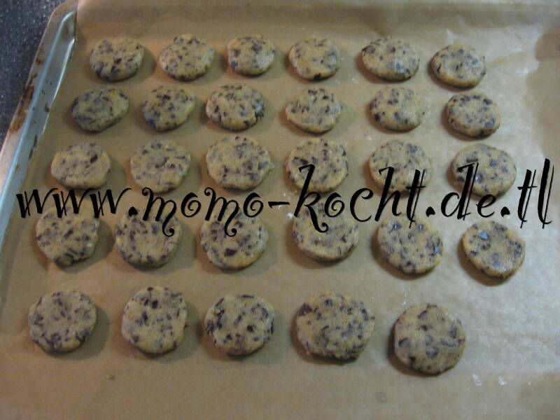 Dann werden aus dem Teig kleine Kugeln geformt. Diese werden dann etwas platt gedrückt und auf einem Blech mit Backpapier verteilt.