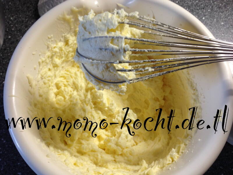 Dann wird die Butter mit dem Dreimix schaumig geschlagen und Esslöffelweise unter ständigem rühren der Pudding dazu gegeben. So lange bis alles vermengt ist.