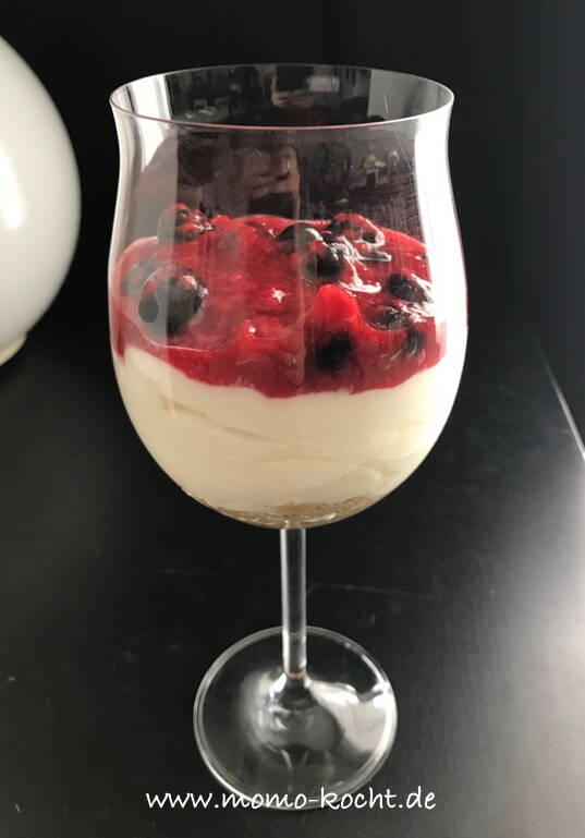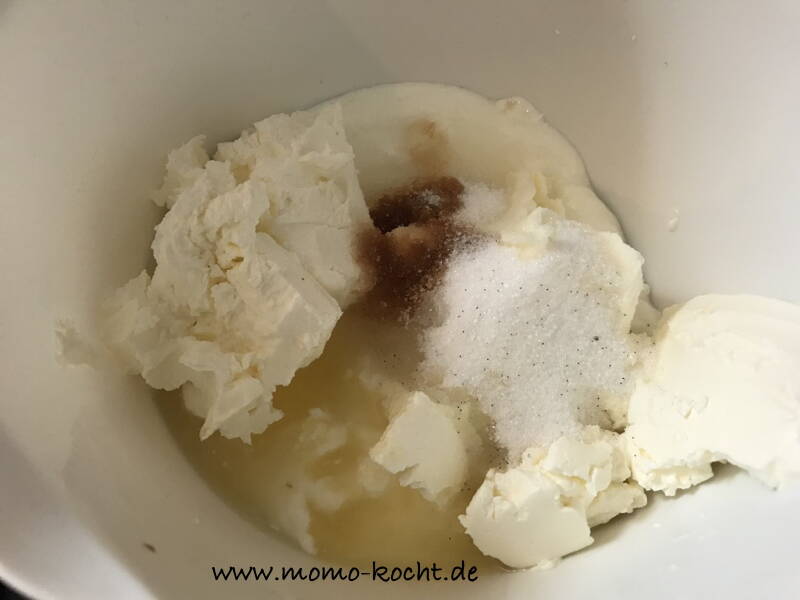 Nun Joghurt, Frischkäse, Zucker, Vanille-Extrakt, Bourbon-Vanille-Zucker und den Zitronensaft in eine Schüssel geben und gut verquirlen. Danach die Sahne unterheben. Dies dann in einen Spritzbeutel geben und in den sechs Gläsern über die Kekse gleichmäßig verteilen. Alle Gläser kommen dann in den Kühlschrank.