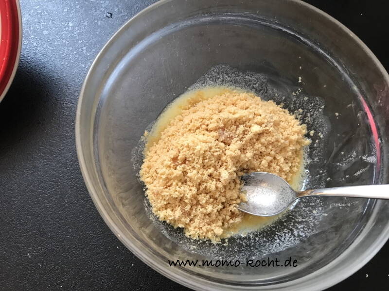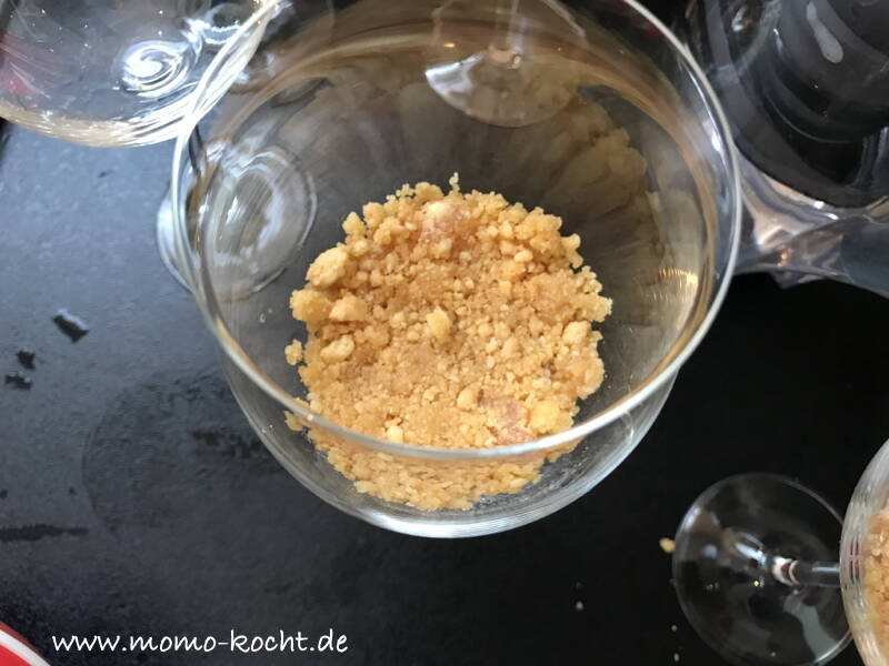 Als erstes die Kekse klein hacken. Entweder indem ihr sie in eine Tüte steckt und sie klein klopft oder in einer Küchenmaschine. Die Butter dann in der Mikrowelle schmelzen lassen, beides dann gut vermischen. Dies dann in sechs Gläser gleichmäßig verteilen (NICHT fest drücken!).