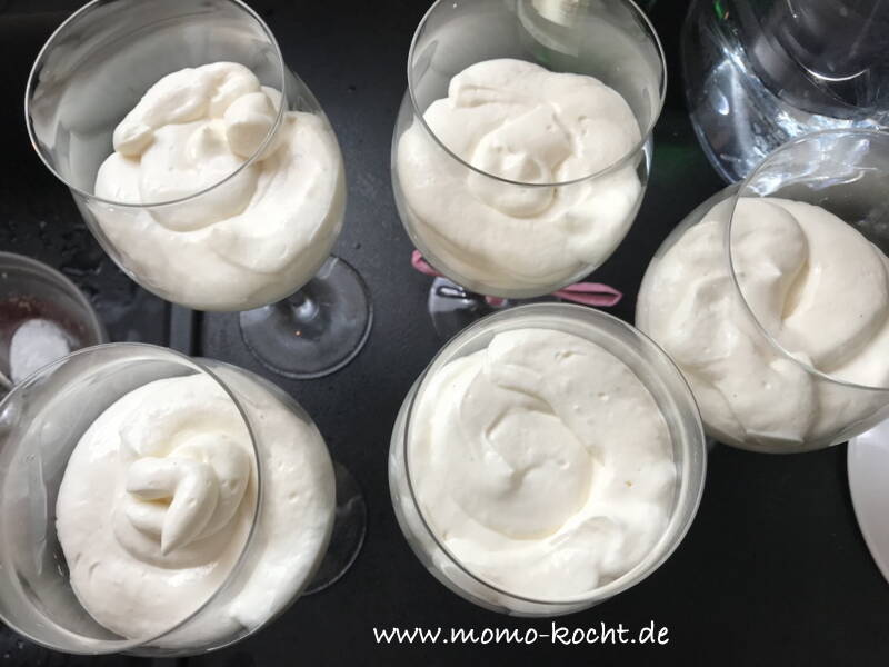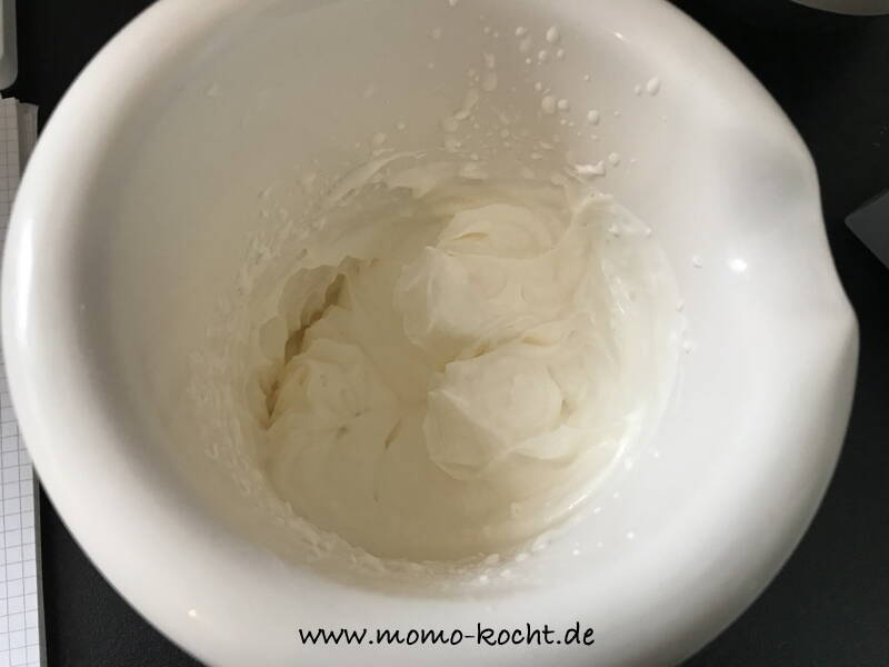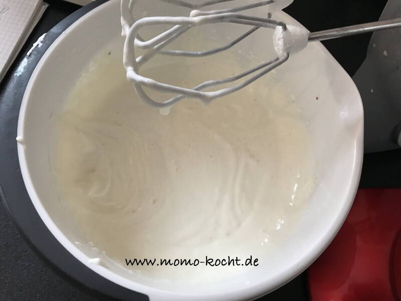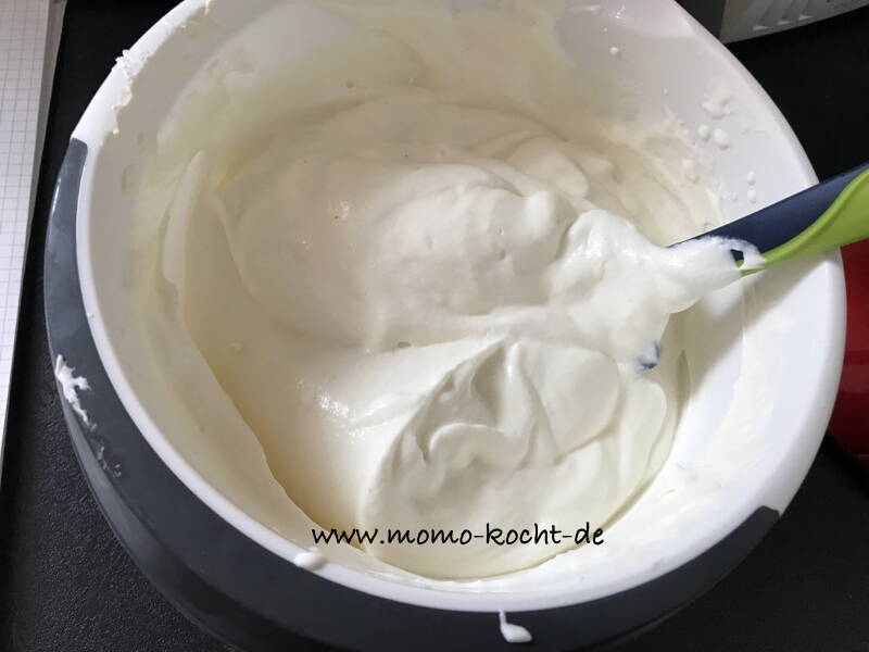Die Sahne mit dem Sahnesteif steif schlagen und zur Seite stellen.