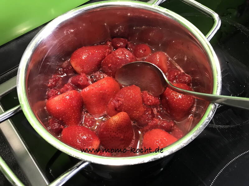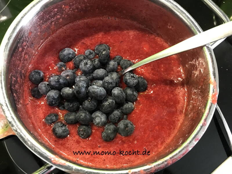 Für die Soße die TK Himbeeren und Erdbeeren mit 2 TL Wasser und 2-3 TL Bourbon-Vanille-Zucker zum kochen bringen. Dies muss dann 10 Minuten köcheln, dabei die Früchte mit einer Gabel verdrücken. Zum Schluss, nach dem kochen gibt man die Blaubeeren dazu. Dies kommt dann zum abkühlen in den Kühlschrank.