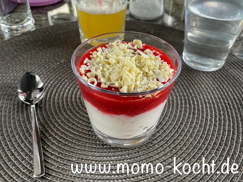 Wenn die Erdbeeren aufgetaut sind werden sie mit Puderzucker und Zitronensaft Konzentrat (Menge nach Geschmack) püriert. Und auch gleichmäßig auf die Creme geben.