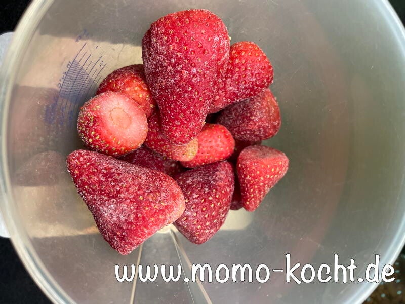 Die Erdbeeren zum auftauen in ein hohes Gefäß geben. In der Zeit machen wir schon mal die Creme: