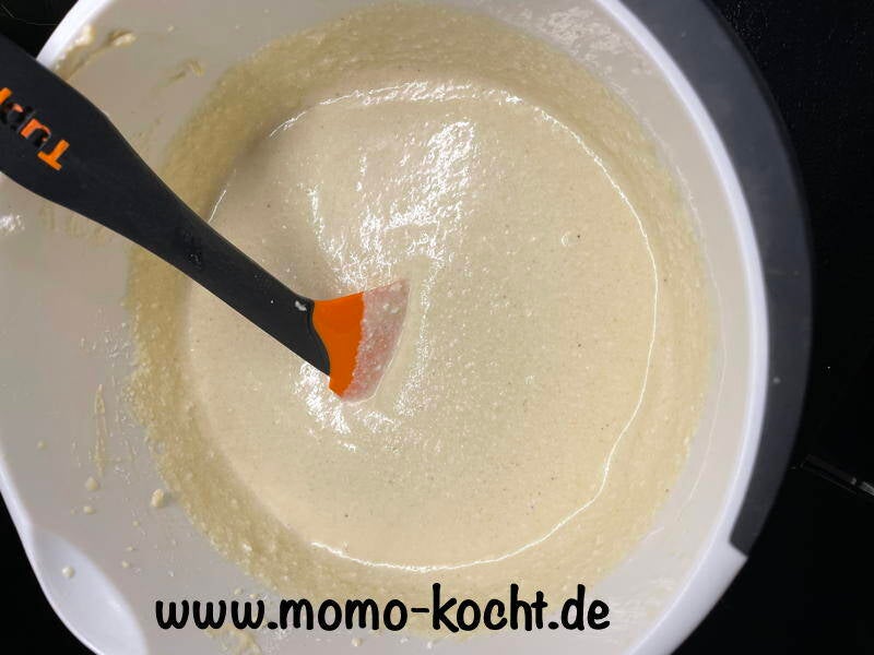 Dazu wieder alle Zutaten in eine Schüssel geben und mit einem Mixer verquirlen.