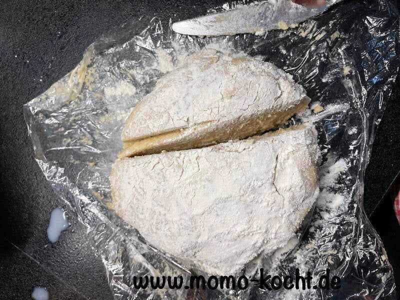Dazu alle Zutaten mit einem Dreimix verkneten. Den Teig dann zu einer Kugel formen und eine Stunde in den Kühlschrank legen.
