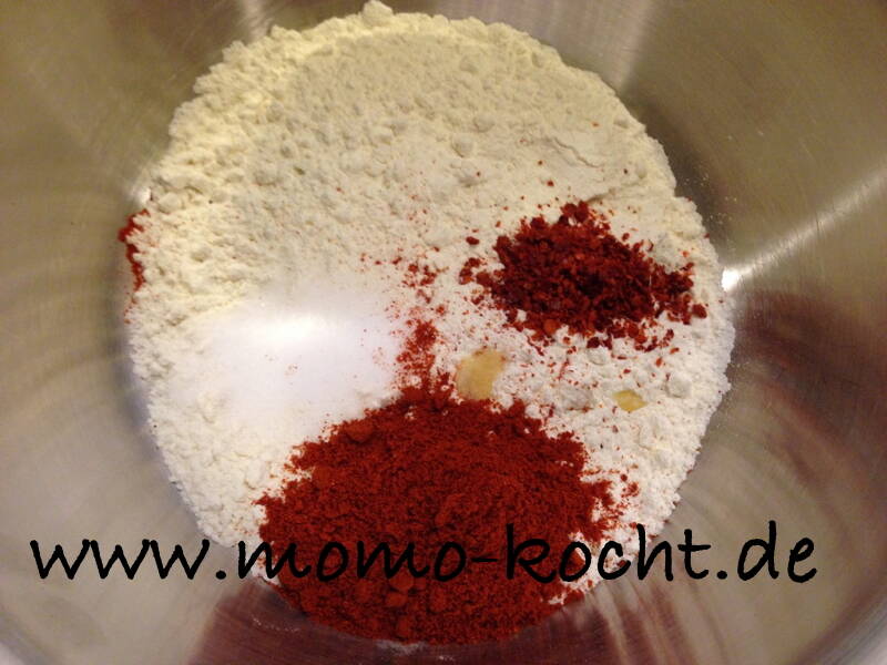 Den Knoblauch mit dem Mehl, dem Salz, dem Pul Biber und dem Paprikaedelsüß in eine Schüssel geben. Dann das Wasser mit einem Schneebesen einrühren, so das keine Klumpen entstehen.