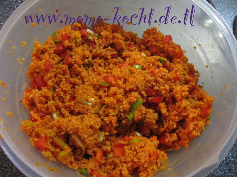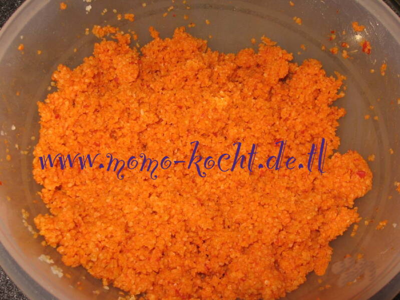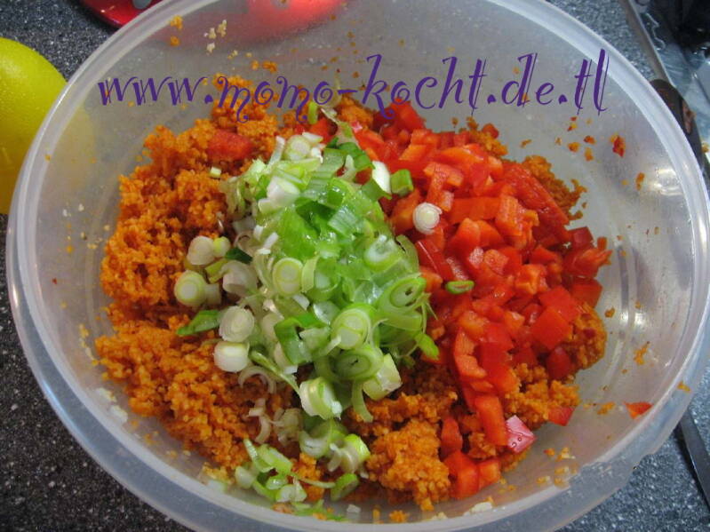 Jetzt müssen die Frühlingszwiebeln in feine Röllchen geschnitten werden und die Paprika in feine Würfel. Beides kommt dann mit in die Schüssel, dazu dann noch die Restlichen Gewürze und alles nochmal gut durchmischen. Man sollte es mind. 30 Minuten ziehen lassen und ggf. noch nachwürzen. Man isst es kalt und dazu passen gut Köfte (Türkische Frikadellen) und Rote Bete Joghurtsoße ( Yogurtlu Pancar).