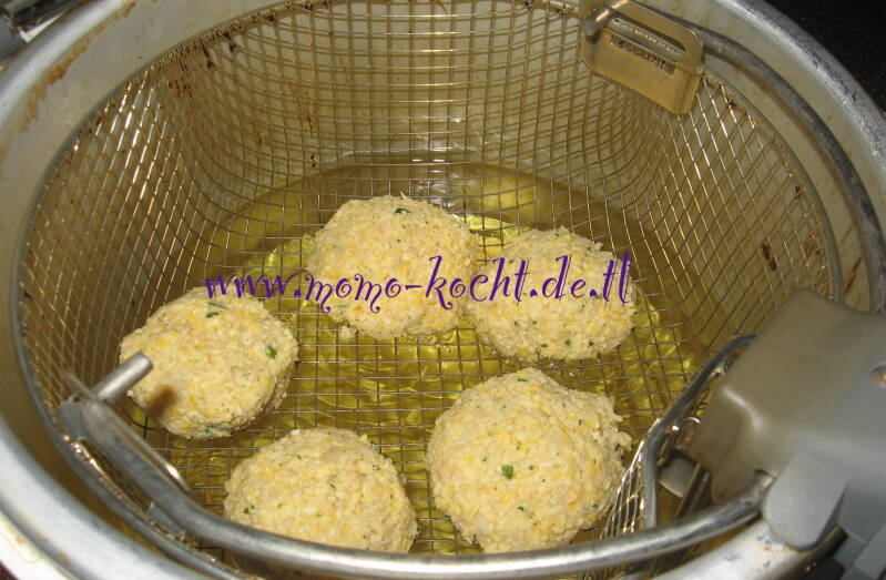 Nun die Fritteuse auf 160 Grad erhitzen und dort die Klümpchen so lange drin lassen bis sie gold-braun und knusprig genug sind.