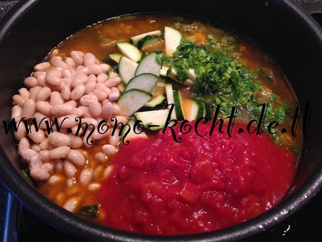 Dann kommen die Bohnen, die Zucchini, die stückigen Tomaten und die Sellerieblätter mit hinzu. Alles gut vermischen und weitere 10 Minuten köcheln lassen.